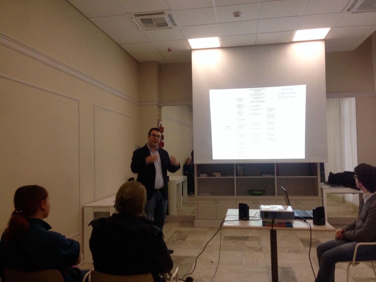 Dopo una presentazione introduttiva del Direttore Gestionale della RSA Paolo Schiavini, è intervenuto il Responsabile dell’Area Anziani Maurizio Benzoni, che ha presentato agli studenti la struttura della Cooperativa e dell’Area di sua competenza. In particolare è stato illustrato il ruolo delle Residenze Sanitarie Assistenziali e delle figure professionali operanti al loro interno, sottolineando, in collaborazione con il Coordinatore dei Servizi della RSA Claudia Zini, l’importanza della figura dell’Educatore Professionale, sia in relazione all’Ospite che in relazione alle altre figure professionali dell’equipe.
